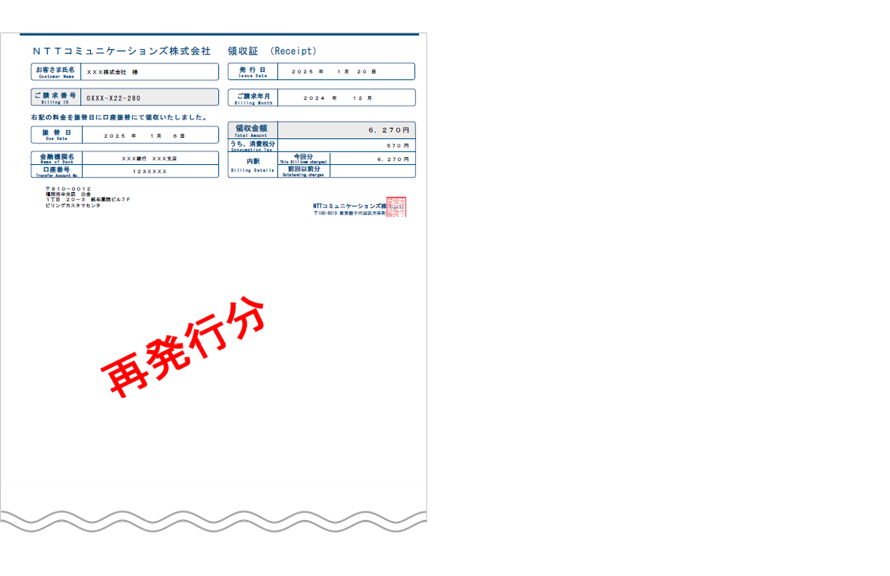 領収証は重複してご提供ができないため、郵送にて領収証を送付させていただいている場合、ビリングステーションよりダウンロードした領収証のPDFには「再発行分」という表記を記載をしています。