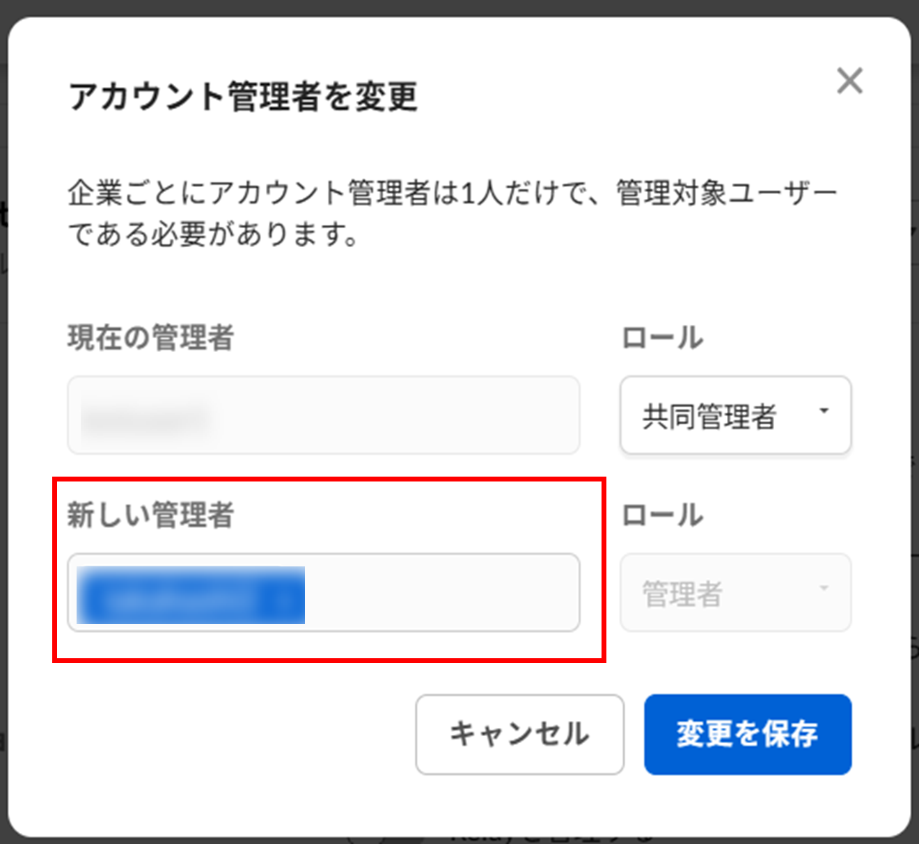 7. [新しい管理者] フィールドに、新しくBoxアカウント管理者になる管理対象ユーザーの名前を入力します。
