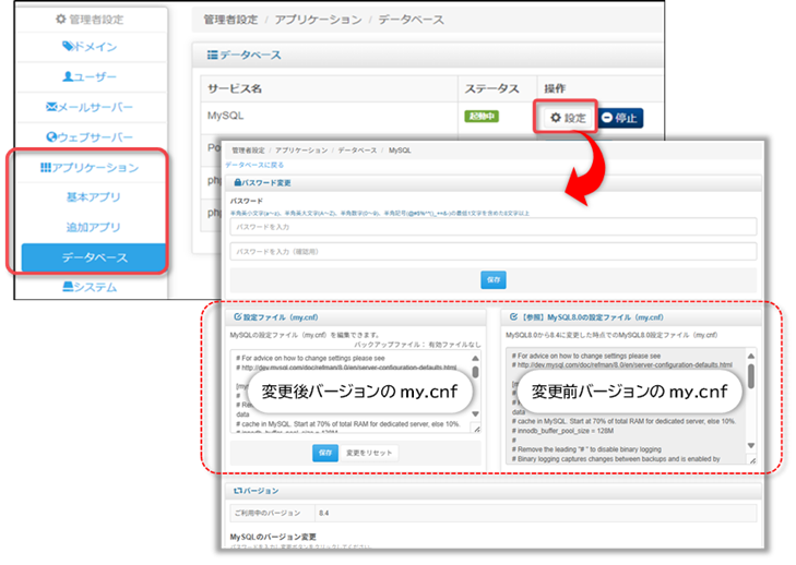 設定ファイル(my.cnf)は、バージョン毎に設置されており、バージョン変更の都度切り替わります。